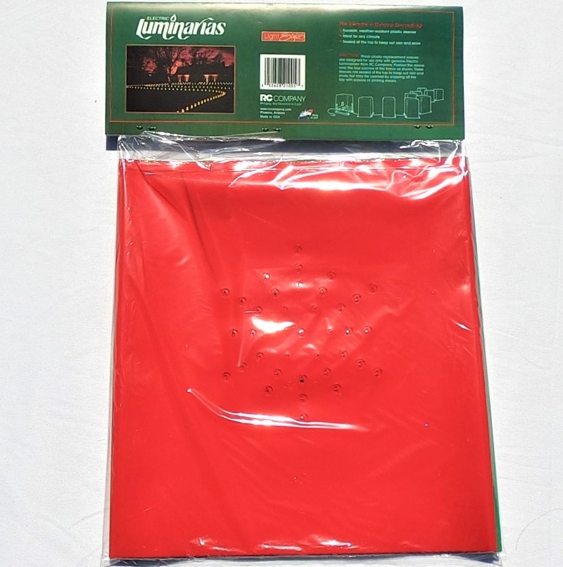 Luminarias are a Spanish tradition originally using a brown paper bag with sand in the bottom and a candle. They were used to light sidewalks and pathways on Christmas Eve. Some say the original name was farolitos. RC Company manufactures Electric Luminarias. Our complete set includes a 30 ft cord with 10 Luminarias spaced every 3 feet. We offer various colored sleeves or bags for your holiday decorating and special events. Our sleeves are sold sealed at the top but may be cut if you prefer more of a bag look. See photo for variation.