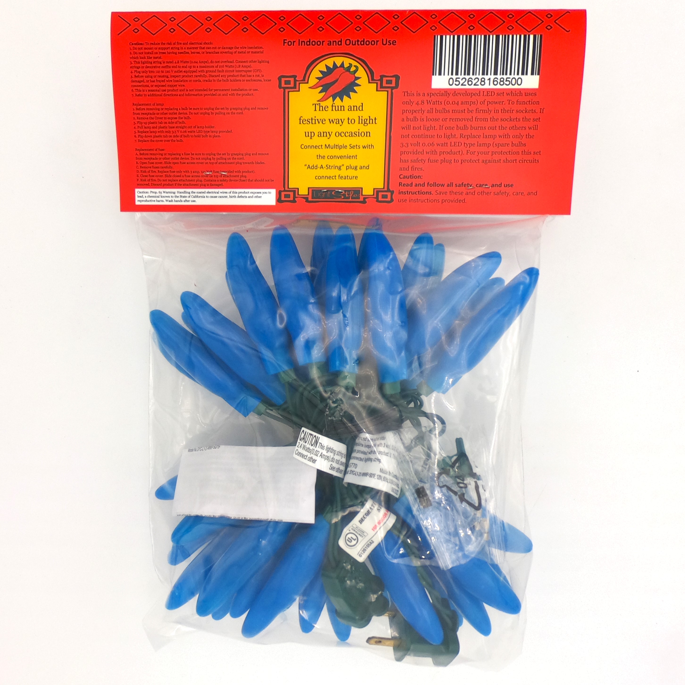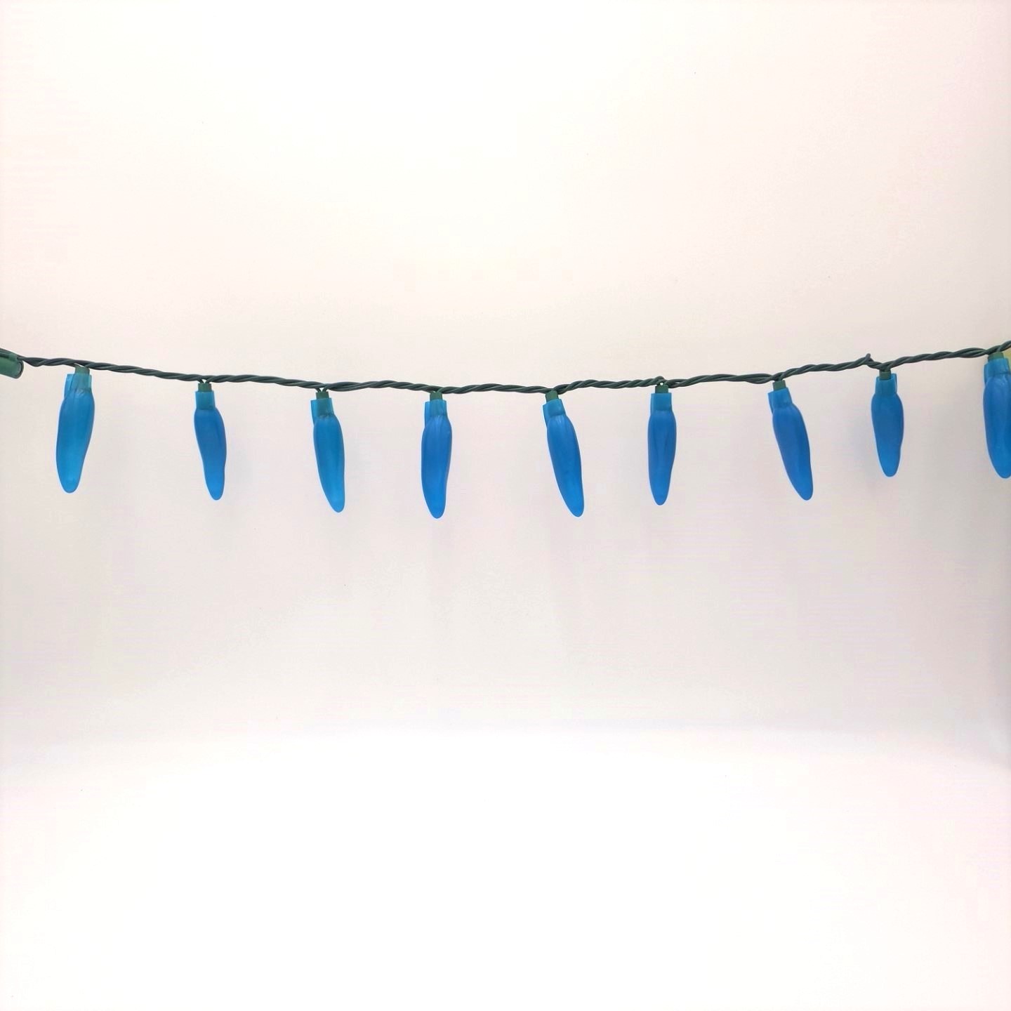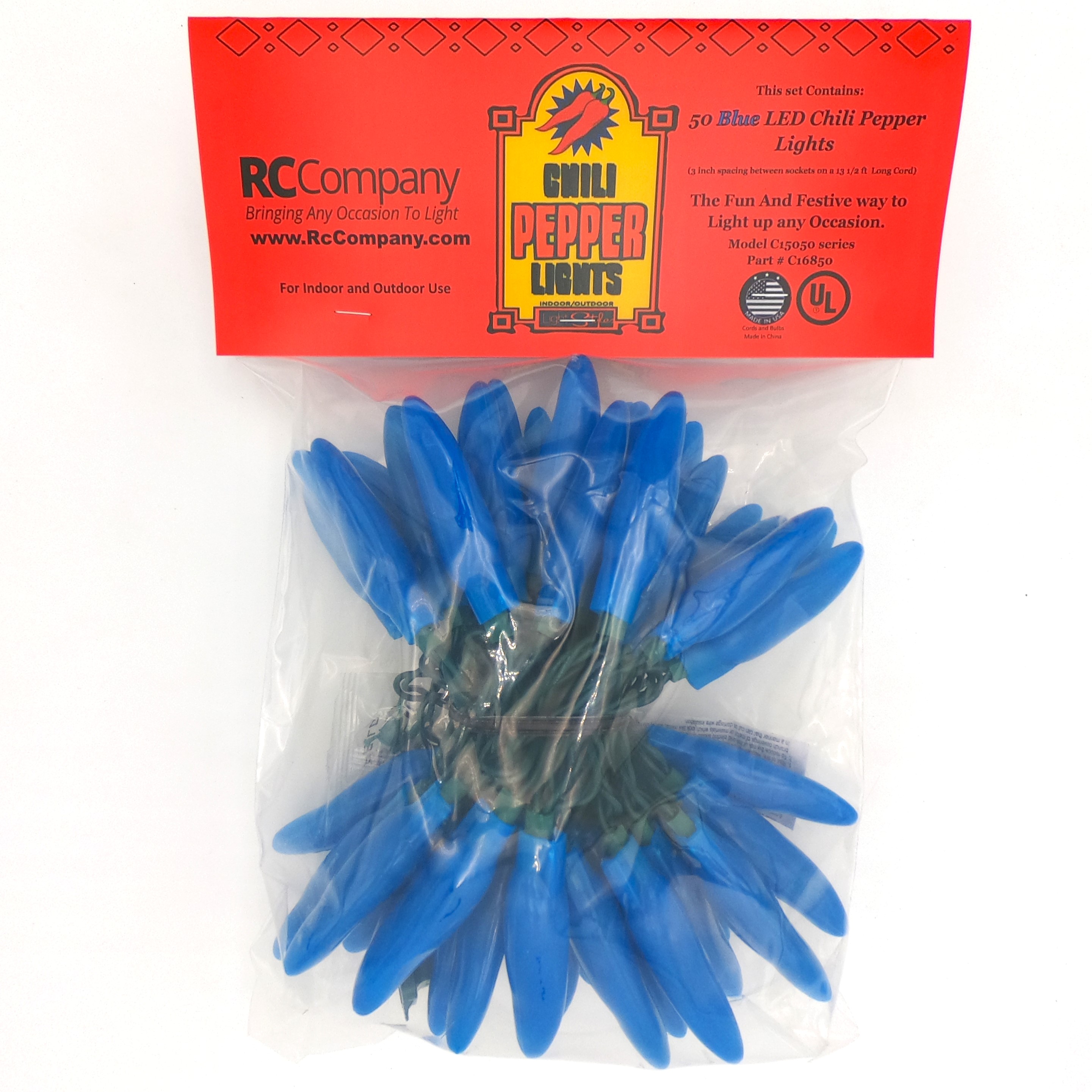 50 LED Blue Chili Pepper Lights (50 Lights, 13 1/2-ft. Long, 3 inch spacing between lights, Each Chili’s measurement is 3 inches long by 3/4 inch wide)