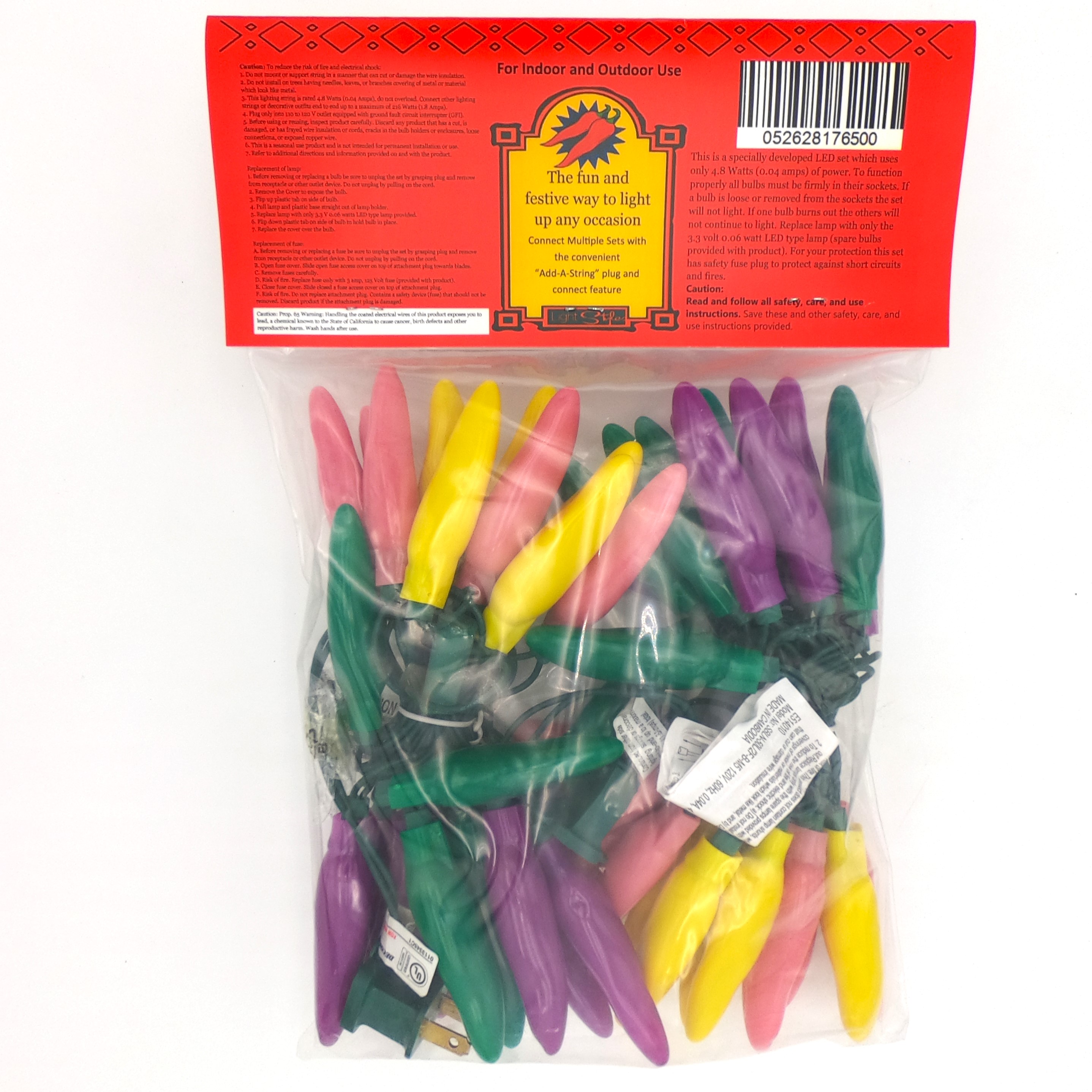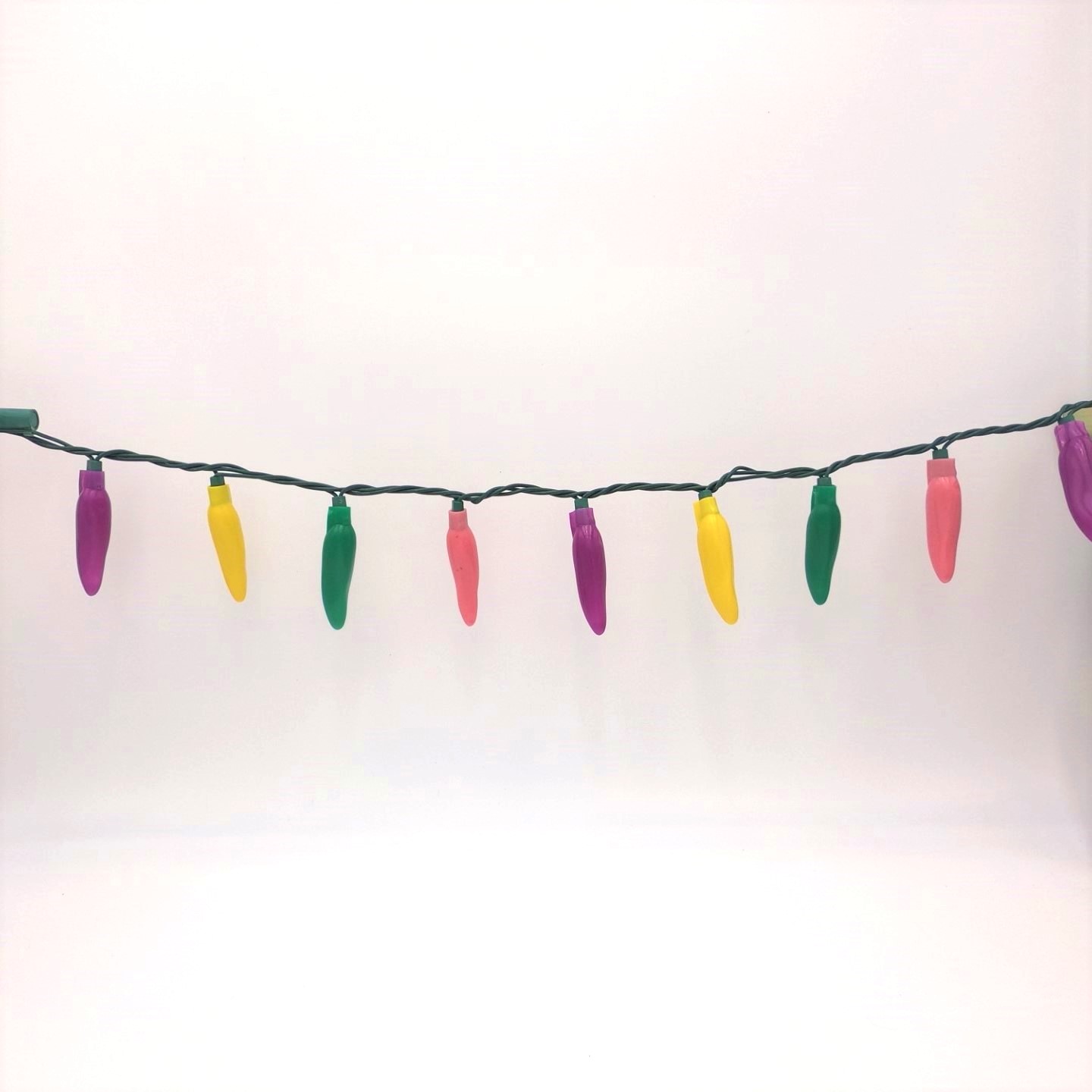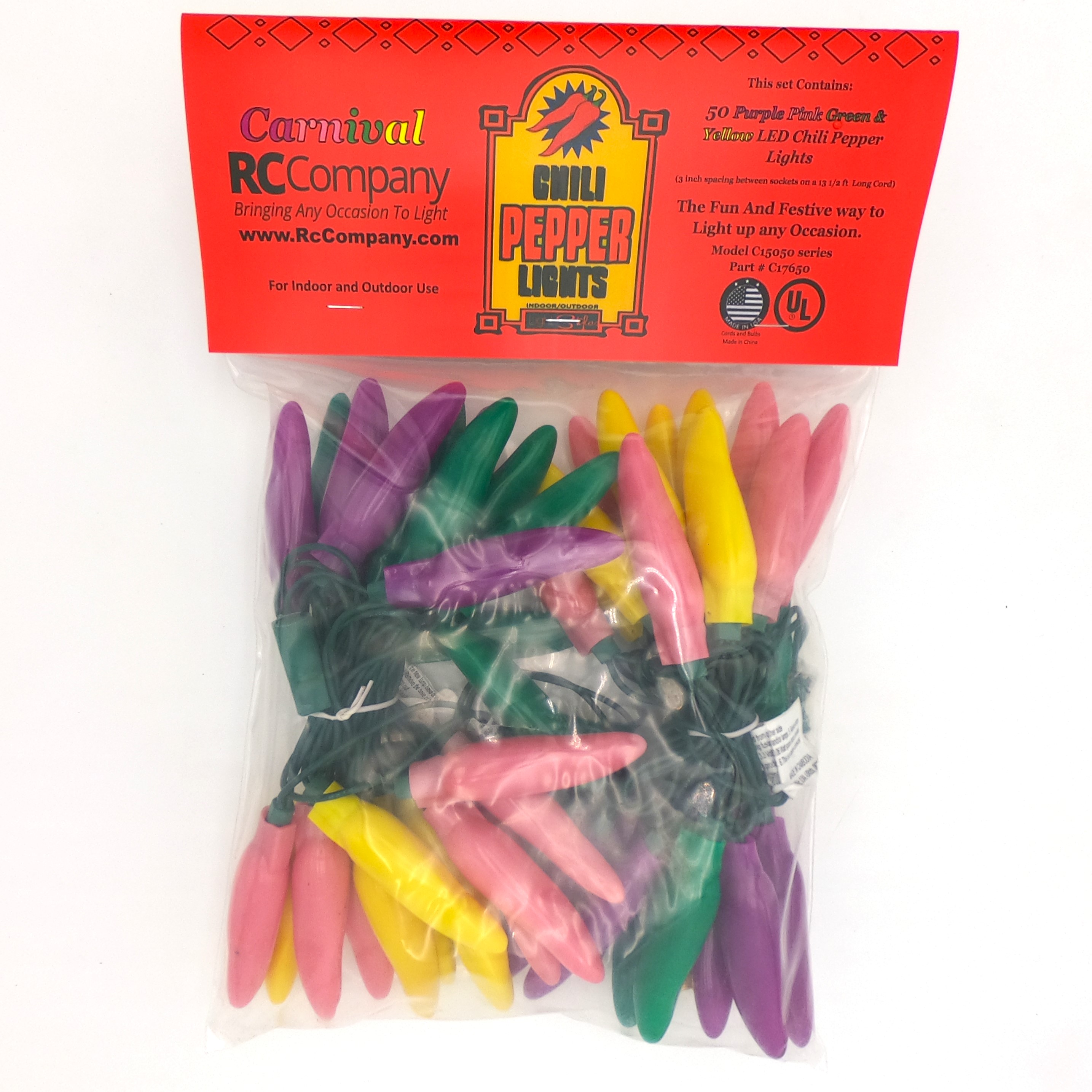 50 LED Carnival Purple, Pink, Green, & Yellow Chili Pepper Lights (50 Lights, 13 1/2-ft. Long, 3 inch spacing between lights, Each Chili’s measurement is 3 inches long by 3/4 inch wide)