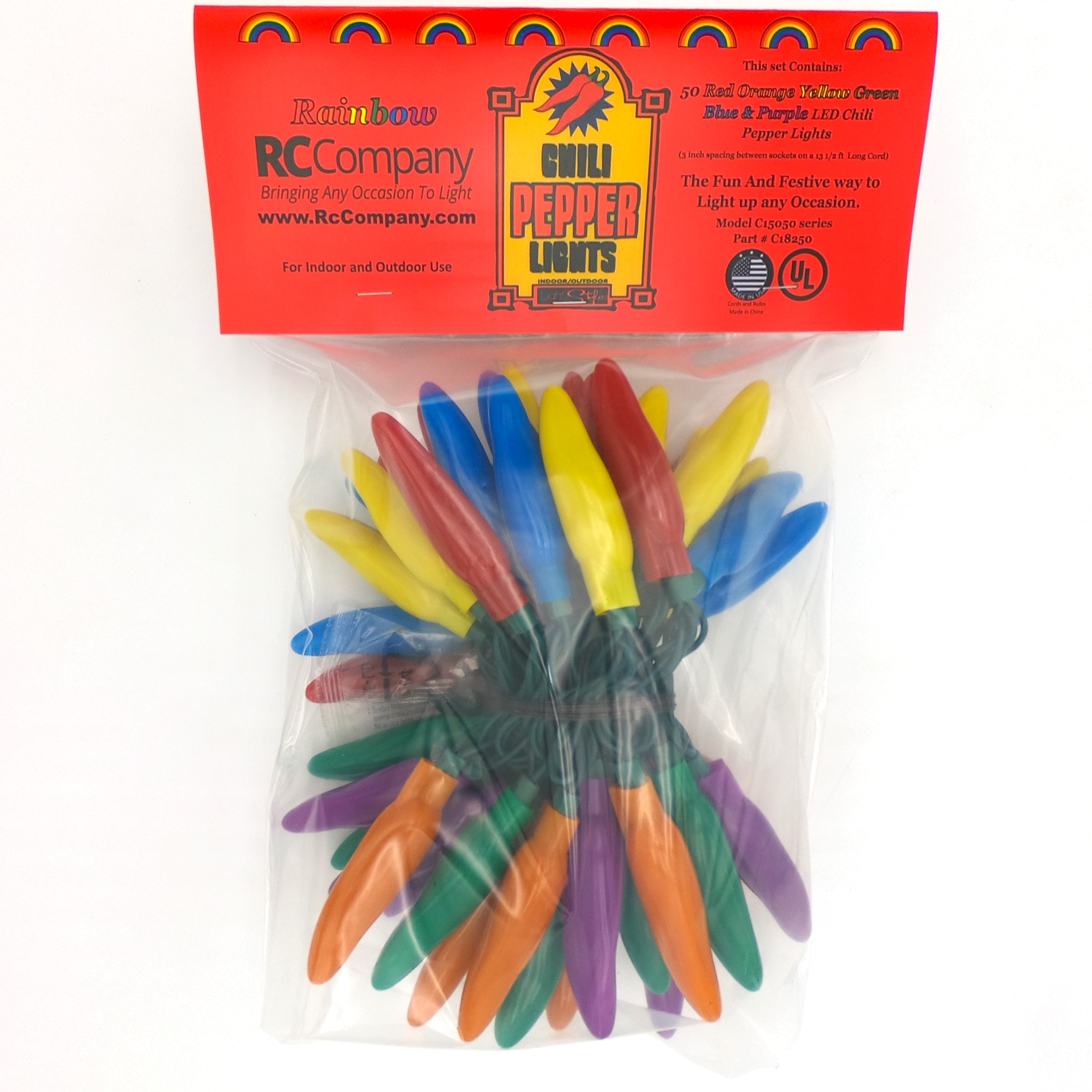 50 LED Rainbow Red, Orange, Yellow, Green, Blue, & Purple Chili Pepper Lights (50 Lights, 13 1/2-ft. Long, 3 inch spacing between lights, Each Chili’s measurement is 3 inches long by 3/4 inch wide)