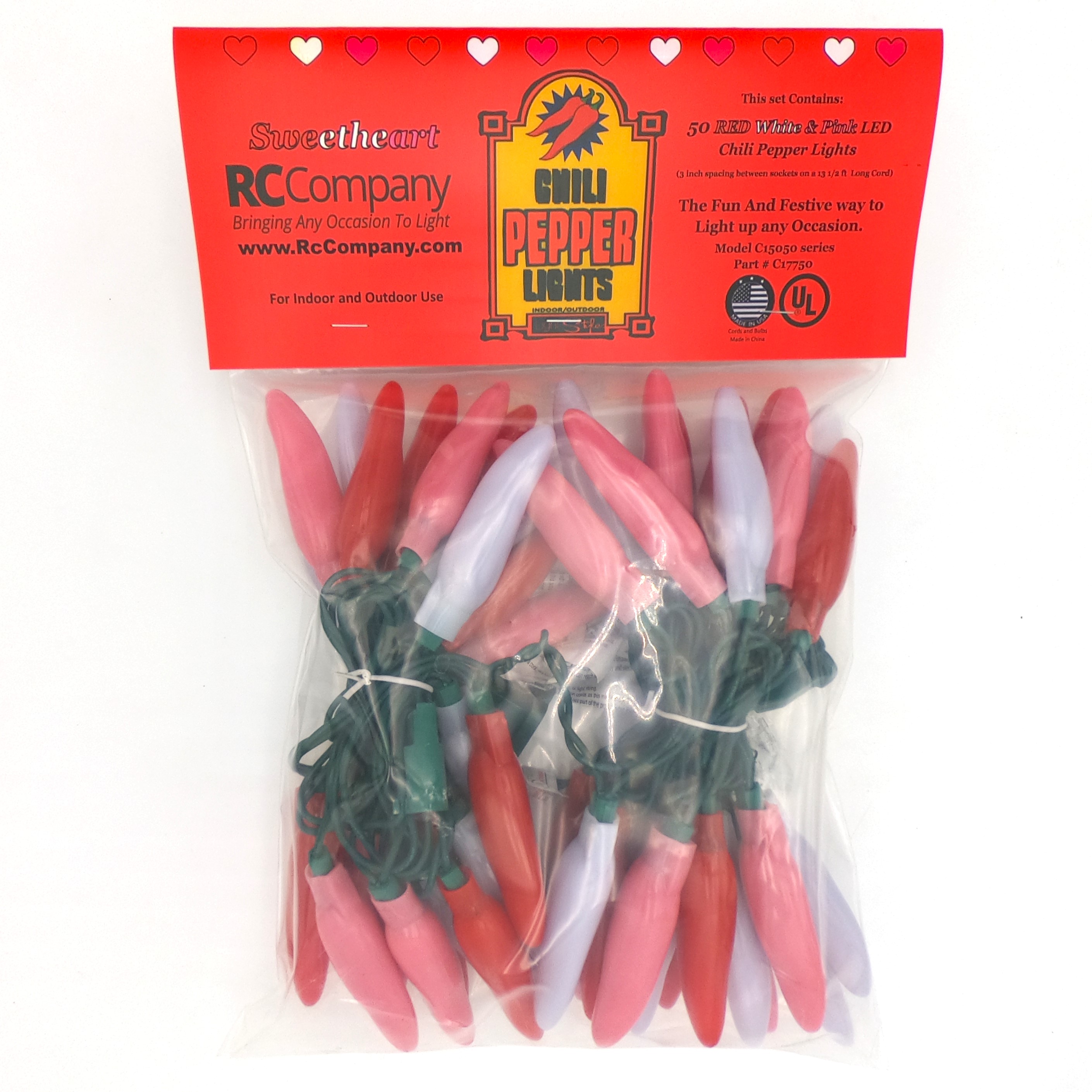 50 LED Sweetheart Red, White, & Pink Chili Pepper Lights (50 Lights, 13 1/2-ft. Long, 3 inch spacing between lights, Each Chili’s measurement is 3 inches long by 3/4 inch wide)