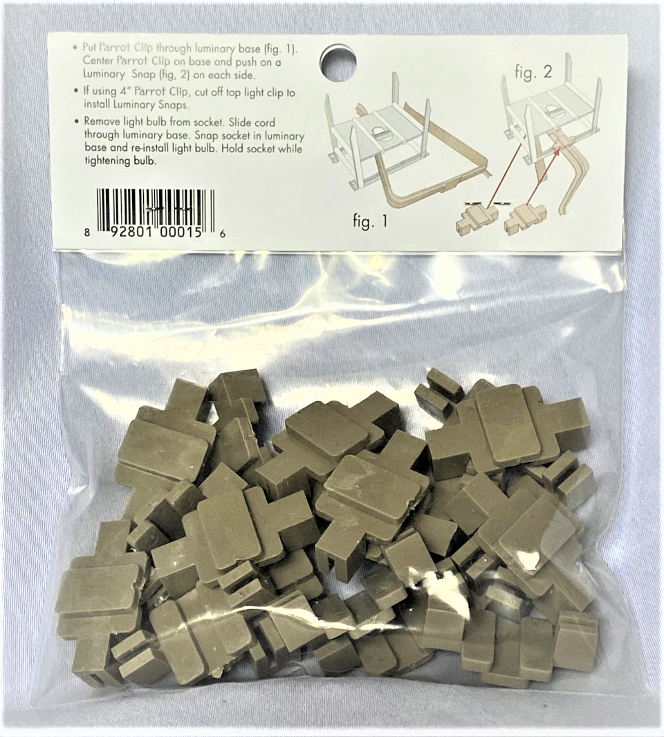 Luminaria Snaps come 20 in a pack which is enough to attach one set of our Luminarias to our 8 inch, 6 inch, or 4 inch Parrot Clips when using our Electric Luminarias on block walls or Parapet style homes.