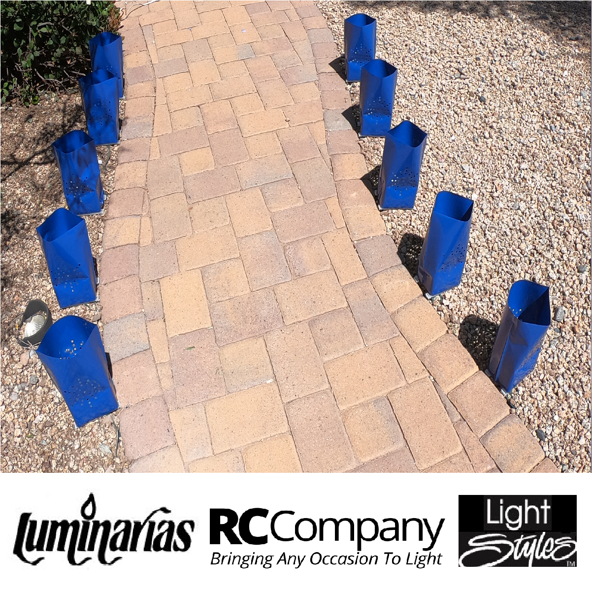 Luminarias are a Spanish tradition originally using a brown paper bag with sand in the bottom and a candle. They were used to light sidewalks and pathways on Christmas Eve. Some say the original name was farolitos. RC Company manufactures Electric Luminarias. Our complete set includes a 30 ft cord with 10 Luminarias spaced every 3 feet. We offer various colored sleeves or bags for your holiday decorating and special events. Our sleeves are sold sealed at the top but may be cut if you prefer more of a bag look. See photo for variation. This set comes with our C9 0.8 watt LED Bulbs which use less electricity, are a little bit brighter than the older C9 7 Watt Bulbs and use the same 30-ft. Outdoor Cord. Online orders are shipped in a plain brown box in order to prevent theft.
