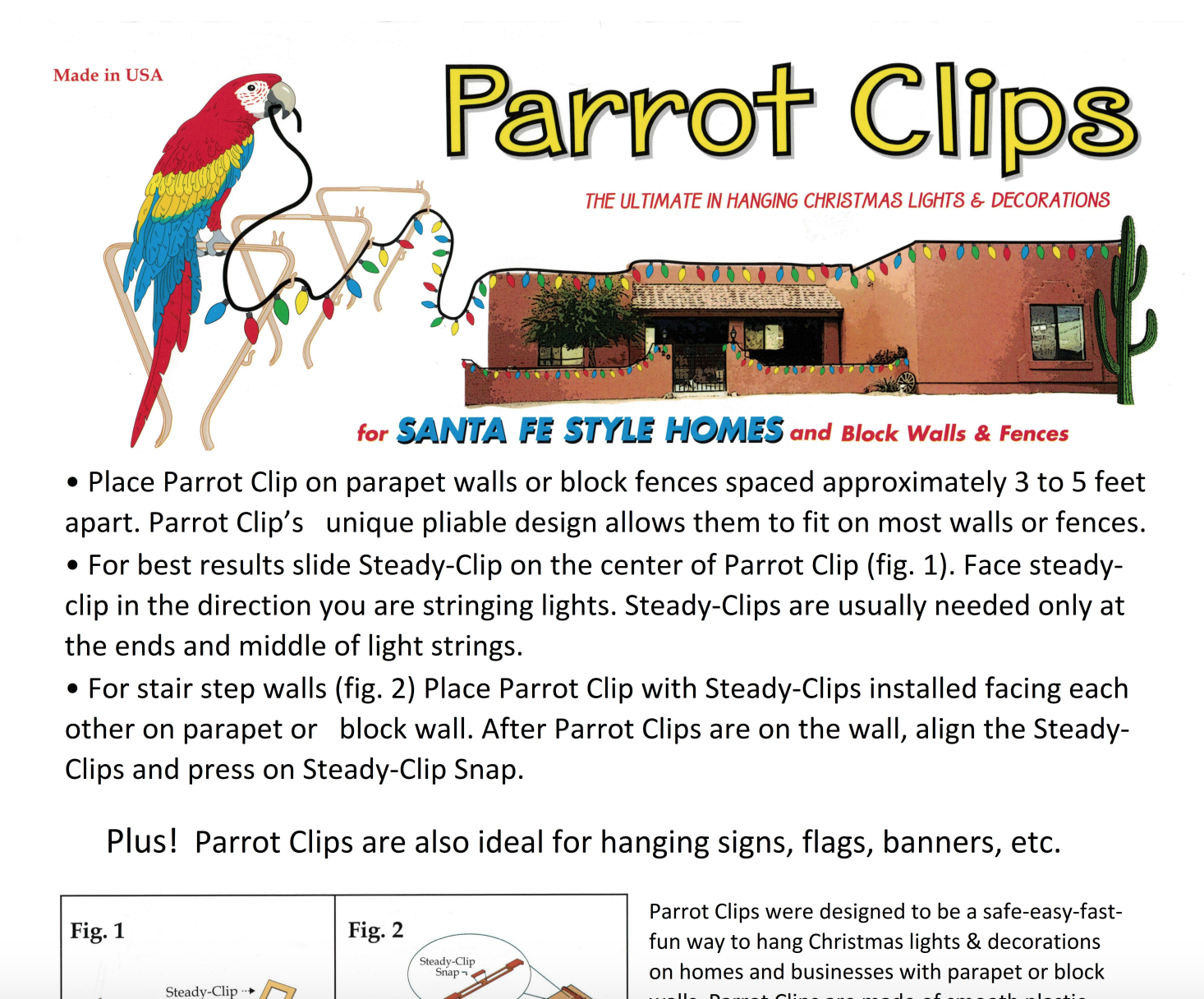 4 inch Parrot Clips 5 pack were designed to be a safe-easy-fast-fun way to hang Christmas lights & decorations on homes and businesses with 4 inch parapet or 4 inch block walls. Parrot Clips are made of smooth plastic that easily conforms to most walls. There is no need for nails, screws, lag bolts, staples, etc. that will cause noticeable damage to your property. Although Parrot Clips are strong enough to hold over 10 lbs., they are not designed for large wood or metal decorations. Place Parrot Clip on parapet walls or block fences spaced approximately 3 to 5 feet apart. The 4 inch Parrot Clips 5 pack comes with 5 Parrot Clips, 5 Steady Clips, 2 Steady Clip Snaps and Directions. If you are using our Parrot Clips with our Electric Luminarias Sets you will also need to purchase our Luminarias Snap Sku:PC0215 to attach the Parrot Clip to the Luminarias Base.